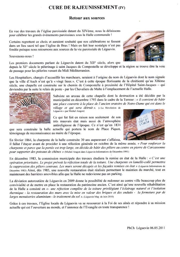 Grâce aux articles de Michel Aragon dans « Léguevin Information » et au « Cahier des Délibérations de la Fabrique de Léguevin » nous pouvons remonter dans le temps pour en découvrir son histoire, puisque nous sommes invités durant les travaux de l’église à nous y retrouver pour la messe de semaine.