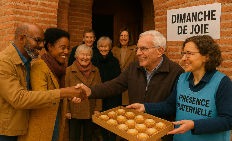 À la sortie de la Messe les membres de Présence Fraternelle faisaient la haie avec des paniers plein de petits gâteaux et nous avons partagé un temps convivial très agréable sur le parvis de l’église, en prenant soin de parler à des personnes que nous ne connaissions pas et qui étaient heureuses de ce temps suspendu. Et chacun est reparti avec au cœur la joie de s’aimer en Jésus-Christ