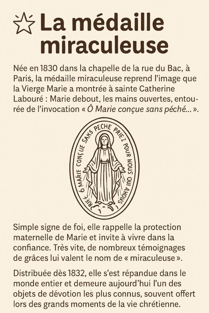 Cette histoire commence au mois de juin 1950, j’avais, à l’époque, douze ans et à l’occasion de ma première communion, une Sœur de l’Ordre de Saint Vincent de Paul (les Filles de la charité), m’a offert une médaille de l’Immaculée Conception.